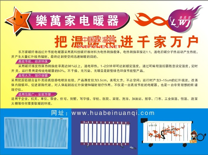 碳纤维远红外电暖器相比于其他电采暖产品具有如下几方面的显著优势:优势一:使用寿命长 优势二:省电!优势三:舒适! 优势四:安全环保优势五:保健远红外保健作用明显,碳纤维远红外电暖器发出4微米—18微米红外线光...碳纤维远红外节能电暖器是采用世界上最新发热体高级碳纤维发热系统,运用先进的航天材料技术加工而成。外壳采用优质铝镁合金制造,高雅美观大方,直接将电能转换为热能,以辐射方式传热的新型高级取暖产品。碳纤维远红外节能电暖器自投放市场以来得到广大用户的一致好评,实践证明碳纤维远红外电暖器相比于其他电采暖产品具有如下几方面的显著优势:优势一:使用寿命长 优势二:省电!优势三:舒适! 优势四:安全环保优势五:保健远红外保健作用明显,碳纤维远红外电暖器发出4微米—18微米红外线光波辐射,与人体发出的红外线处于同一波段范围,极易被人体吸收,“暖”效应明显, 碳纤维远红外节能电暖器的红外波长3~15um,具有十分强烈的渗透力,能够渗透皮下4~5mm,从内部温暖身体,给予生物细胞活力。因此对人体起到远红外保健和辐射理疗作用,促进新陈代谢,且无异味无污染。本产品不仅是高效节能的电暖器,也是一台非常理想的频谱理疗仪。优势六:高效节能 优势七:经济优势八:效率高优势九:用途广泛广泛用于企业、机关、单位、宿舍、住宅、别墅、写字楼、学校、医院、宾馆、洗浴、加油站、报亭、门市、工业保温、恒温、蔬菜大棚等。优势十:款式多,碳纤维远红外节能电暖器,分为挂式、支架式、壁画式等600-2200W,三大系列十余种产品,并且具有体积小重量轻、造型美观大方、结构坚固耐用,无需增加任何配件,可随意变换移动使用位置等特点,是现代家居的首选产品,21世纪的新型采暖产品。壁挂式碳纤维远红外电暖器,是采用先进技术研制开发的一种新型电采暖的专利产品。采用高科技长丝碳纤维材料制成,具有性能稳定,安全可靠,环保节电,经济实用等特点。属于国家认定的绿色环保电加热产品。产品特点:电源电压:220(V) 电源频率:50(Hz) 温度范围:5-30(℃) 升温时间:1-3(min